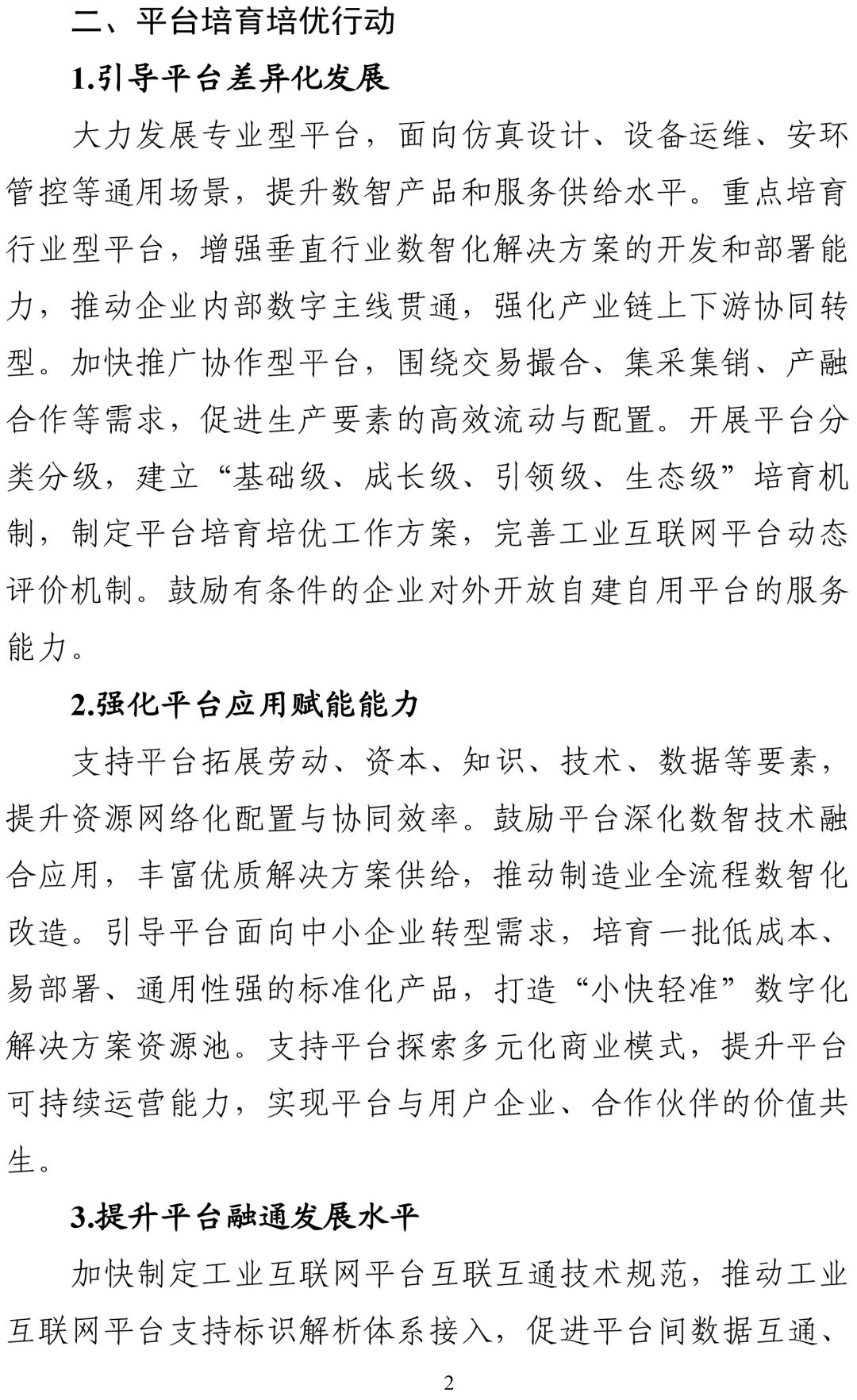 一是平台培育培优行动。为推动工业互联网平台走专业化、特色化发展路径,打造既各具特色、又相互联系的平台体系,《行动方案》提出:要引导平台差异化发展,加快培育专业型、行业型和协作型三类平台,建立“基础级、成长级、引领级、生态级”四级培优体系;要强化平台应用赋能能力,丰富优质解决方案供给,打造“小快轻准”数智化解决方案资源池,支持平台探索多元化商业模式;要提升平台融通发展水平,加快制定平台互联互通技术规范,推动平台开展跨区域产能协作与创新资源对接。