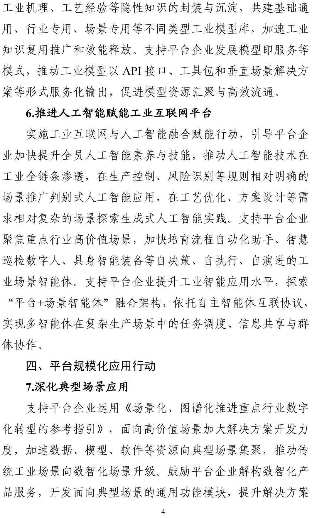 实施工业互联网与人工智能融合赋能行动,引导平台企业加快提升全员人工智能素养与技能,推动人工智能技术在工业全链条渗透,在生产控制、风险识别等规则相对明确的场景推广判别式人工智能应用,在工艺优化、方案设计等需求相对复杂的场景探索生成式人工智能实践。