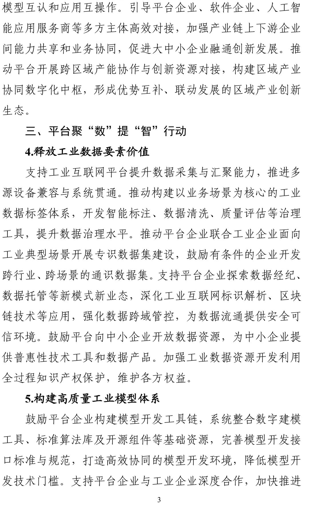 《行动方案》坚持目标导向和问题导向相结合,在深入分析工业互联网平台发展经验和面临形势的基础上,重点从三方面推动平台高质量发展。一是着力推动平台差异化发展。引导平台企业进一步科学定位、深耕细作,面向制造、服务制造,走专业化、特色化、差异化发展路径,宁求小而精、不图大而全,既能展现个体优势,又能协同发展、错位发展、联动发展,共同推动平台体系实现从“量多面广”向“质优效高”的根本转变。二是着力强化人工智能赋能。充分发挥平台前期在工业数据汇聚、行业机理沉淀、应用生态培育等方面形成的先发优势,推动平台企业把握“人工智能+制造”创新发展机遇,在高质量数据集建设、工业大模型开发、工业智能体培育等方面加大研发投入和应用推广力度,把先发优势转化为竞争优势,为制造业数智化转型提供有力支撑。三是着力深化场景应用牵引。场景是连接技术和产业、打通研发和市场的桥梁。我国制造业具有规模大、门类多、体系全的特点,为工业互联网平台提供了海量的应用落地场景和广阔的价值创造空间。要推动平台立足场景“小切口”,做好融合“大文章”,不断提升服务能力,推动信息化和工业化在更广范围、更深程度、更高水平上实现融合发展。