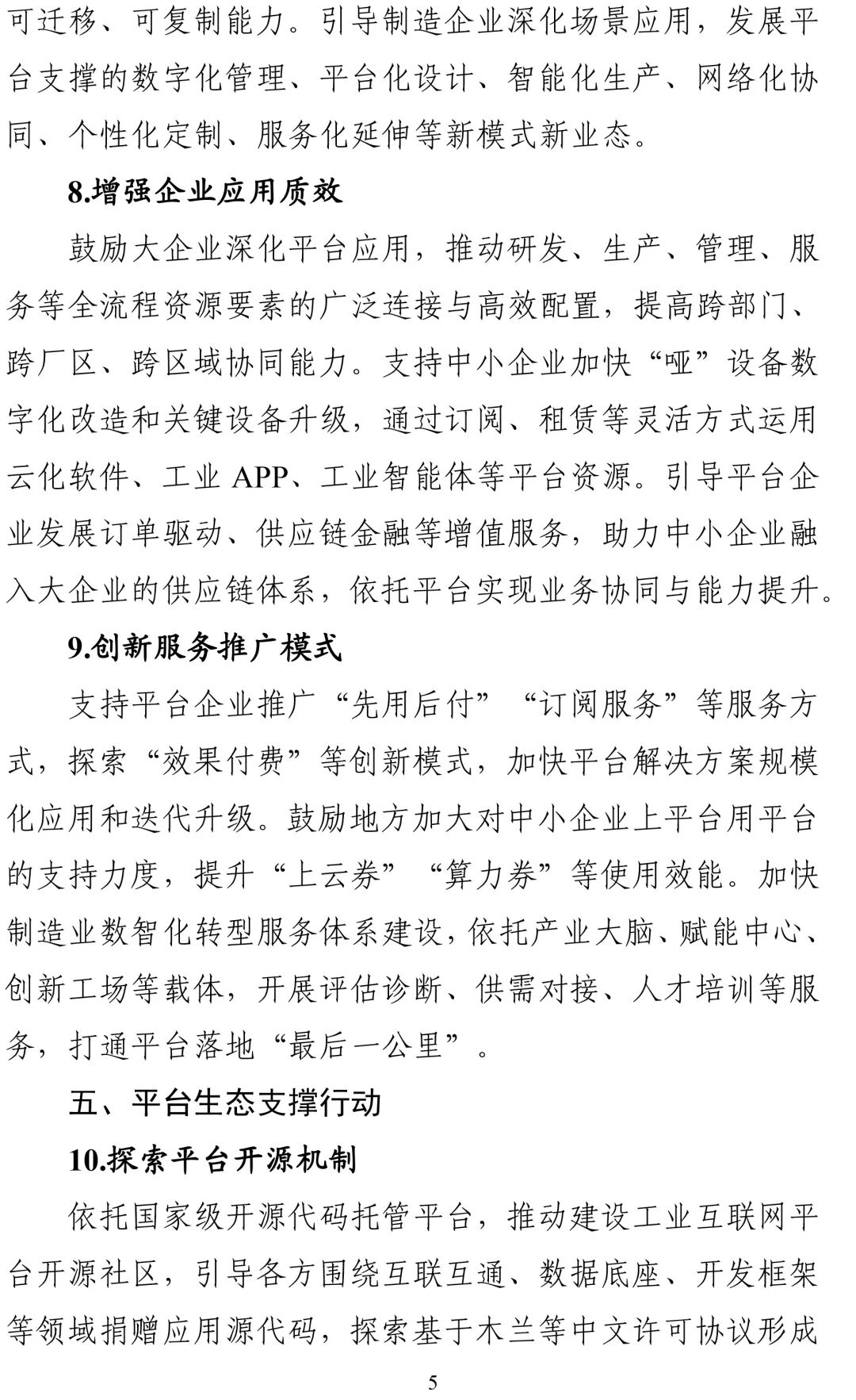 三是平台规模化应用行动。为拓展工业互联网平台覆盖广度和应用深度,以创新深化应用,以应用反哺创新,《行动方案》提出:要深化典型场景应用,支持平台企业面向高价值场景加大解决方案开发力度,引导制造企业深化场景应用,发展平台支撑的新模式新业态;要增强企业应用质效,鼓励大企业深化平台应用,提高跨部门、跨厂区、跨区域协同能力,支持中小企业加快设备改造,广泛运用平台资源,引导平台企业发展订单驱动、供应链金融等增值服务,助力大中小企业协同发展;要创新服务推广模式,支持平台企业推广“先用后付”“订阅服务”等服务方式,探索“效果付费”等创新模式。