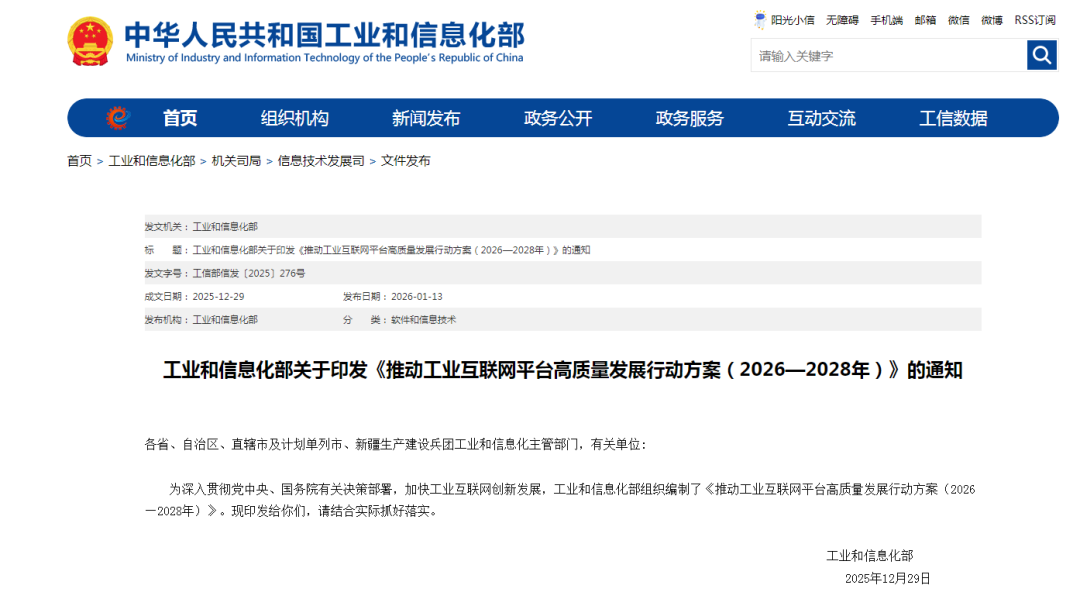 工业和信息化部印发《推动工业互联网平台高质量发展行动方案(2026—2028年)》。
